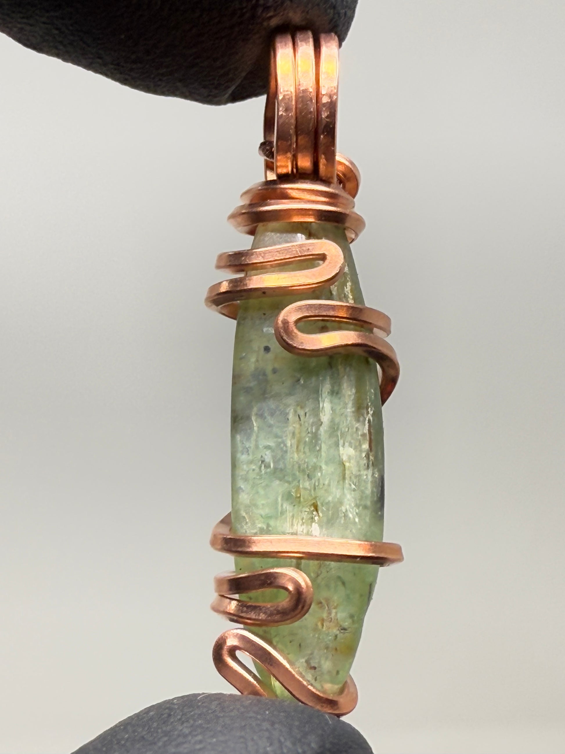 Expertly crafted, this Green Kyanite Copper Pendant showcases the unique beauty of jewelry grade copper paired with stunning green kyanite. With a variety of cords available (sold separately), this pendant is the perfect addition to any jewelry collection. Experience the healing and balancing properties of green kyanite while adding a touch of elegance to your look.